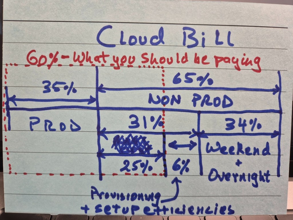Think about your non-production environments. Typically your non-prod footprint will be at least twice the size, if not thrice, of your prod footprint. This means you may be spending twice as much on your non-prod environments, around 65% of your cloud bill.